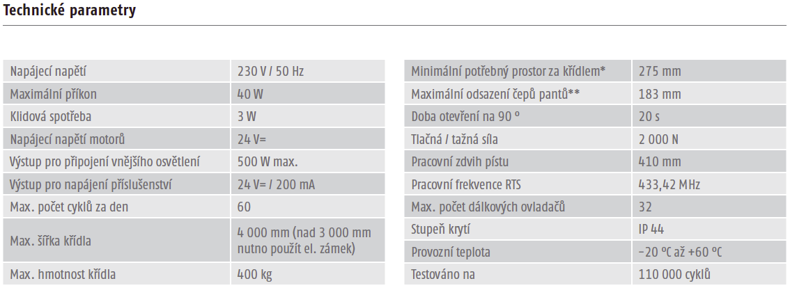 Vratové pohony SOMFY pro křídlové brány. Šířka křídla až 4m / hmotnost až 400kg. Spolehlivý a výkonný pohon pro masivní ocelové křídlové brány. Základní rozdělení pohonů zde Výhody: Řídicí elektronika Control Box 3S RTS: rychlá instalace, intuitivní nastavení Robustní motor Zatížitelnost až 60 cyklů otevření / zavření za den Zpomalené dovření Vychází vstříc požadavkům Instalace nevyžaduje speciální nástroje ani sváření Nastavitelné pilířové držáky pro neobvyklé instalace (volitelné příslušenství) Lze objednat pouze jeden motor pro jednokřídl brány Kompatibilní se solární sadou v místech bez přívodu elektrické energie VÝHODY PRO KONCOVÉ UŽIVATELE: Uživatelsky příjemný provoz - bezpečný provoz - detekce překážky - ovládání světla a odemykání branky pomocí ovladače - detekce překážky, zpomalené dojezdy - široká škála volitelného příslušenství - záložní baterie — sada (volitelné příslušenství) pro případ výpadku napájení - možnost nouzového odblokování zevnitř pro ruční otevření brány pomocí speciálního klíče VÝHODY PRO PROFESIONÁLY: Elektronika 3S - rychlá instalace, plně přizpůsobitelná a intuitivní Vysoký výkon pohonu - pro brány s křídlem až 4 m / 400 kg. - mobilní aplikace pro snadnou montáž a nastavení - elektronické magnetické dorazy přístupné ze shora - nastavitelné pilířové držáky pro přizpůsobení podmínkám v místě instalace - intuitivní programování parametrů pomocí 3S technologie - extra přítlačná síla v poloze zavřeno SOUVISEJÍCÍ PRODUKTY: - výstražný maják s integr. anténou Master Pro 24V - dálkový ovladač Keygo RTS - bezpečnostní natáčecí infrazávory - záložní baterie (zdroj) - bezdrátová kódová klávesnice RTS (kovová) - Standard Receiver RTS Sady: Standard (2x Motor, 1x Řídící jednotka, 2x Dálkový ovladač Keygo RTS) Komfort (2x Motor, 1x Řídící jednotka, 2x Dálkový ovladač Keygo RTS, 1x Záložní baterie, 1x Maják s anténou, 1x Infrazávora) 1 motor (1x Motor) * obsahuje Majak ECOPPRO 24V bez anteny ** ke kazdemu pohonu je dodavan pilirovy drzak *** ke kazde sade je dodavana ridici jednotka Control Box Ixengo Navod ke stazeni ZDEDoplňkové parametry